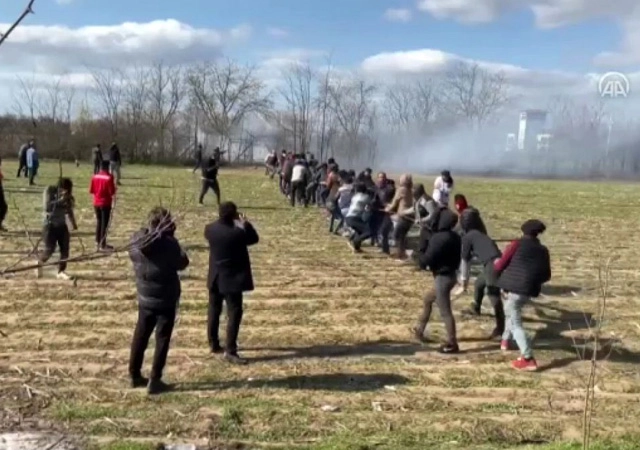 Yunanistan'ın jiletli tel, sivri uçlu demirlerle oluşturduğu barikata yaklaşan mülteciler, Yunan güçlerinin plastik mermilerine de maruz kalıyor.