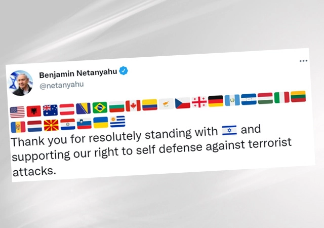 İsrail Başbakan Binyamin Netanyahu, resmi Twitter hesabından yaptığı paylaşım ile kanlı saldırılarda İsrail'e açıktan destek veren ülkelerin bayraklarını sıraladı.