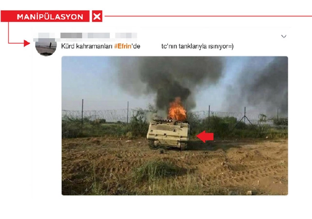 Dün de sosyal medyada Zeytin Dalı Harekatı'nı karalama amaçlı paylaşılan 3 fotoğrafın operasyonla ilgisi olmadığı ve gerçeği yansıtmadığı ortaya çıkarılmıştı. Farklı olaylara ait görselleri sosyal medyaya servis eden kullanıcıların bir kısmı hesaplarını kapatmış bir kısmı ise paylaşımlarını kaldırmıştı.