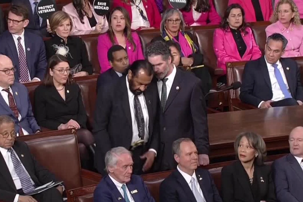 Demokrat Temsilciler Meclisi Üyesi Green, Meclis Başkanı Mike Johnson'ın uyarılarına rağmen Trump'ın konuşmasını bölmeye devam etmesi üzerine güvenlik görevlileri tarafından salondan çıkarıldı.