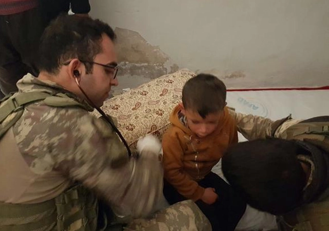 TSK'ya bağlı askeri doktorlar, Afrin'in güneybatısında YPG/PKK-DEAŞ'tan kurtarılan Mervane köyünde çoğunluğu kadın ve çocuk onlarca hastayı muayene etti.