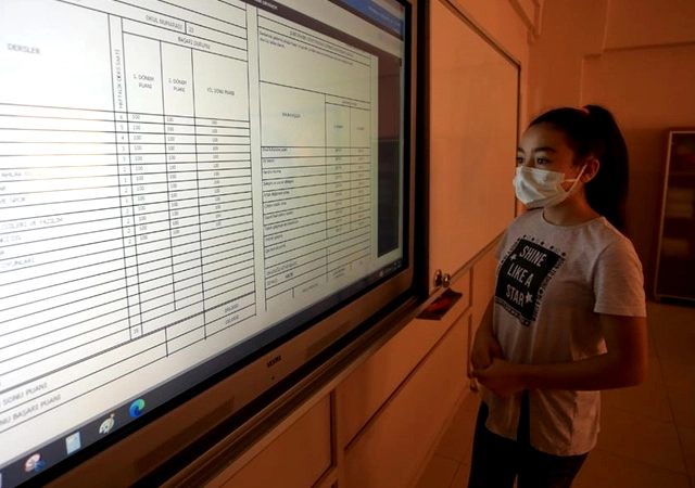 Eğitim öğretime devam eden öğrenciler okullarında akıllı tahtalardan karnelerini inceledi. Öğrenciler, heyecanla bir birlerinin ders notlarına baktı.