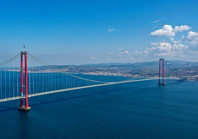 Köprümüzün temelini 4 yıl önce yine bir 18 Mart günü atmıştık. Firmamız Güney Koreli ortaklarıyla birlikte kolları sıvadı köprümüzü söz verdiğimiz tarih olan bugünkü açılışa hazır hale getirdi. Türkiye orta açıklığı itibarıyla dünyanın en uzun köprüsüne sahip Japonya'yı geride bırakarak, bu alanda ilk sıraya yerleşti. Orta açıklık uzunluğu bakımından dünyadaki ilk 10 köprünün 3'ünün ülkemizde olduğunu da hatırlatmak isterim.