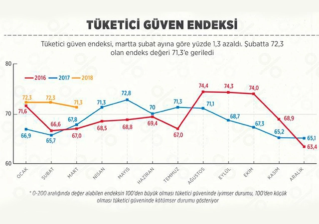 TÜİK ve Türkiye Cumhuriyet Merkez Bankası iş birliğiyle yürütülen anket sonuçlarından hesaplanan tüketici güven endeksi, bu ay bir önceki aya göre yüzde 1,3 azalırken, şubatta 72,3 olan endeks değeri 71,3'e geriledi.
