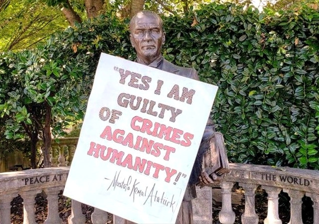 Yapılan alçak saldırıda Atatürk'ün heykelinin üstüne İngilizce olarak “Yes I am guilty of crimes against humanity!” yani "Evet, insanlığa karşı işlenen suçlardan suçluyum!" yazan bir yazı astılar.