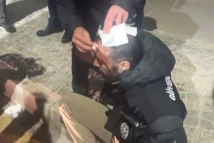 Bu sırada gruptan atılan taşların başına isabet ettiği bir polis memuru yaralandı. Sağlık ekipleri, başından yaralanan polise olay yerinde müdahale etti.