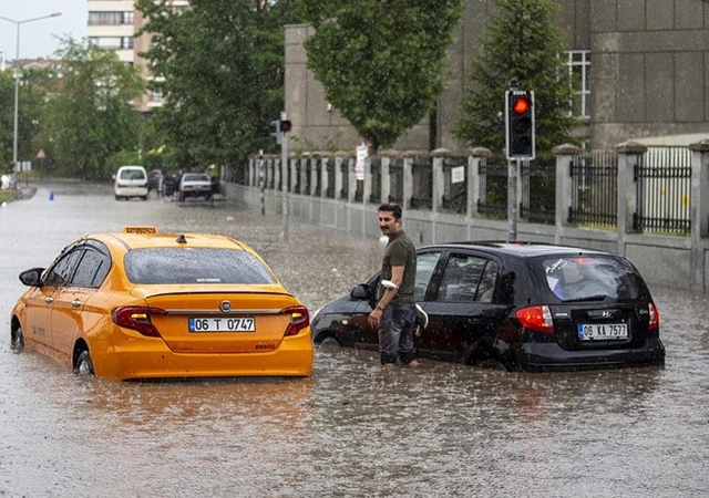 Yağış nedeniyle Etimesgut İstasyon Caddesi üzerinde yoğun su birikintileri meydana geldi, bazı araçların yolda kaldığı görüldü.
