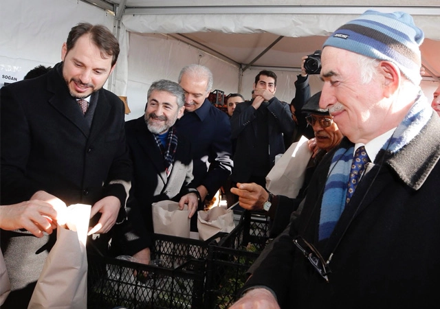 Diğer yandan Berat Albayrak, tanzim noktalarına gelen vatandaşlarla sohbet etti, ürünleri poşetlere yerleştirdi.
