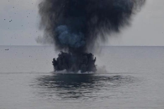 Sahil Güvenlik Komutanlığının botu ile Karadeniz açıklarına çekilen insansız deniz aracının, bir süre sonra patlatıldığı görüldü.