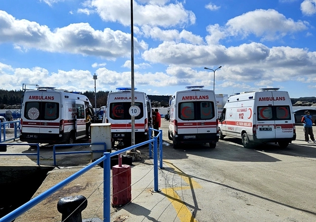 Kabatepe Limanı'nda da çok sayıda ambulans hazır bekletiliyor.