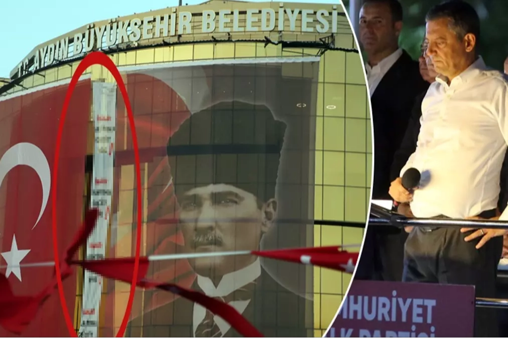 Aydın Büyükşehir Belediye Başkanı Çerçioğlu, CHP Genel Başkanı Özgür Özel'in konuşmasına karşı, belediye binasına "İmar rantına geçit yok" yazılı bir pankart astırdı.