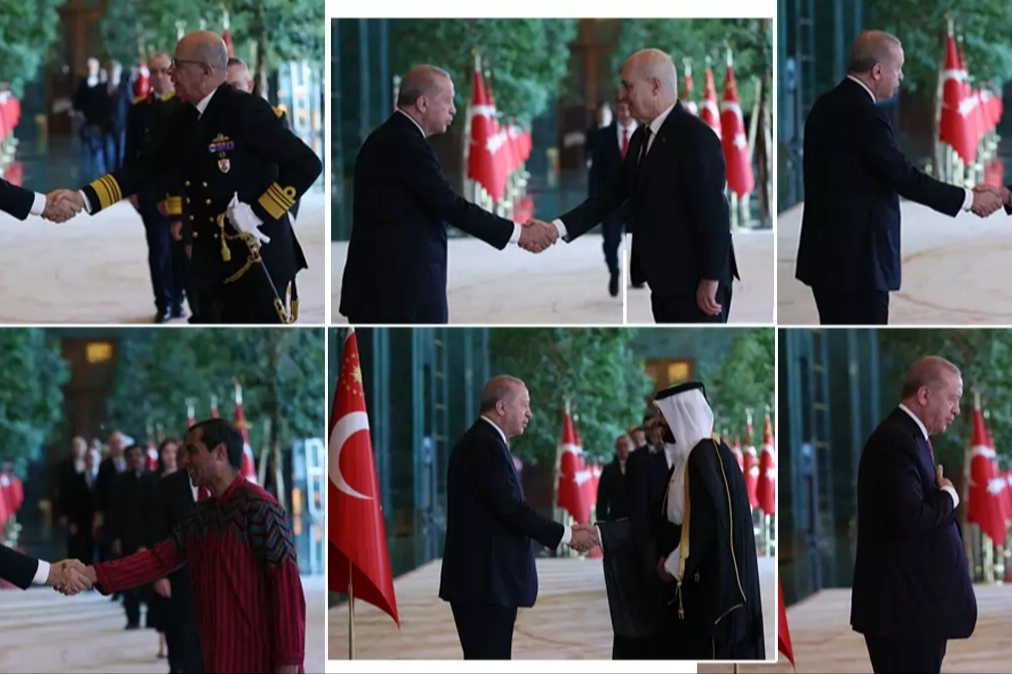 Buradaki törende, TBMM Başkanı Numan Kurtulmuş, Cumhurbaşkanı Yardımcısı Cevdet Yılmaz, AK Parti TBMM Grup Başkanı Abdullah Güler, Yargıtay Başkanı Ömer Kerkez, Danıştay Başkanı Zeki Yiğit, Cumhurbaşkanlığı Kabinesi üyeleri, Genelkurmay Başkanı Orgeneral Selçuk Bayraktaroğlu ve kuvvet komutanları, Diyanet İşleri Başkanı Safi Arpaguş, TBMM üyeleri, Cumhurbaşkanlığı Genel Sekreteri Hakkı Susmaz, Cumhurbaşkanlığı İletişim Başkanı Burhanettin Duran, MİT Başkanı İbrahim Kalın, Savunma Sanayii Başkanı Haluk Görgün, Ankara Valisi Vasip Şahin, Ankara Büyükşehir Belediye Başkanı Mansur Yavaş, kamu kurumlarının yöneticileri, Ankara'da görevli büyükelçiler, yabancı misyon şefleri, uluslararası kuruluşların temsilcileri, Erdoğan'a bayram tebriklerini sundu.