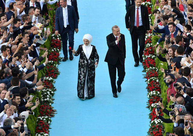 Erdoğan, "Bu defa Cumhurbaşkanlığı makamına değişen yönetim sisteminin gereği olarak yürütme organının tüm yetkileriyle geldik, Allah bizi milletimize mahcup etmesin." ifadelerini kullandı.