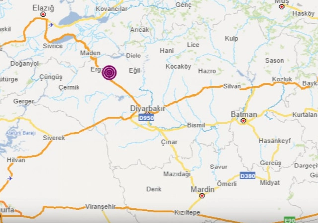 Afet ve Acil Durum Yönetimi Başkanlığının (AFAD) internet sitesinde yer alan bilgiye göre, saat 11.44'de Diyarbakır'ın Ergani ilçesinde 4 büyüklüğünde sarsıntı kaydedildi.