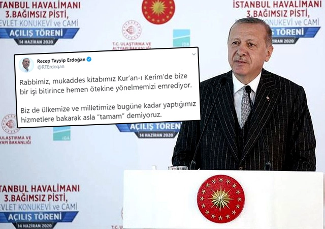 İstanbul Havalimanı'na ilişkin bilgilerin yer aldığı bir görseli paylaşan Cumhurbaşkanı Erdoğan, şu notu düştü: "Rabbimiz, mukaddes kitabımız Kur'an-ı Kerim'de bize, bir işi bitirince hemen ötekine yönelmemizi emrediyor. Biz de ülkemize ve milletimize bugüne kadar yaptığımız hizmetlere bakarak asla 'tamam' demiyoruz."