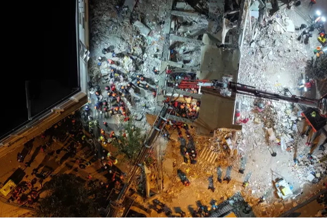 Yüzlerce kişiden oluşan arama kurtarma ekipleri, alandaki molozları kovalarla çıkarırken, beton bloklar vinç desteğiyle askıya alındı.