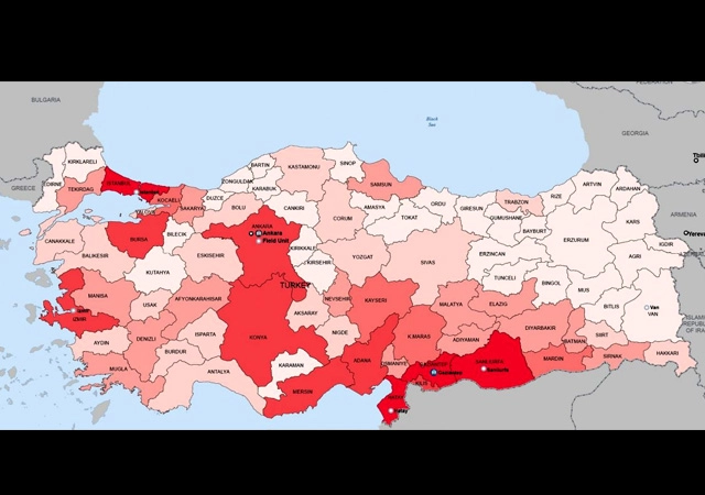 Haritaya göre Diyarbakır, Elazığ, Malatya, Adıyaman, Muğla, Manisa, Sakarya gibi iller ise 10 bin-50 bin arasında Suriyeliyi ağırlıyor.
