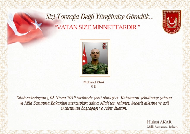 Yapılan açıklamada, şehit için Allah'tan rahmet, kederli ailesine, Türk Silahlı Kuvvetleri (TSK) ile Türk milletine başsağlığı dilekleri de ifade yer aldı.