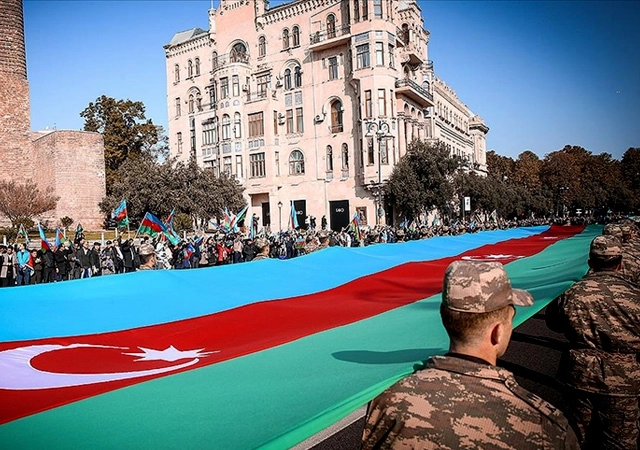 "Zafer Günü" kutlamaları kapsamında Bakü'nün Azneft Meydanı'ndan başlayan yürüyüşe, askeri lise öğrencileri, Sınır Hizmetleri Komutanlığına bağlı süvari birlikleri, Karabağ Savaşı gazileri ve vatandaşlar katıldı.