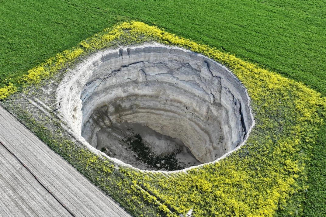 Yoğun sulama faaliyetinin yapıldığı tarlaların arasında oluşan devasa çukur, her geçen yıl genişleyerek büyüyor.
