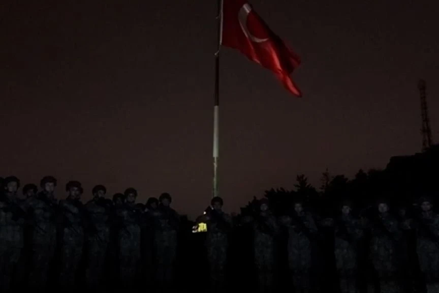 Paylaşımda, görev başındaki Mehmetçiğin depremin gerçekleştiği dakikalarda Türk bayrağının altında saygı duruşunda bulunduğu görüntülere de yer verildi.