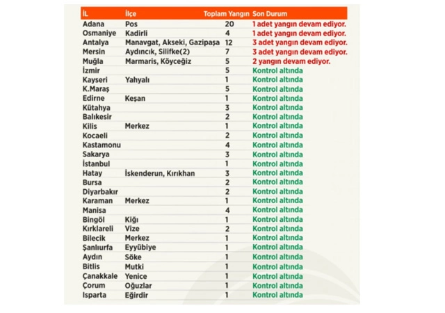 Paylaşılan tabloda; Adana, Osmaniye, Antalya, Mersin başta olmak üzere, 26 ilde çıkan yangınların 88'inin kontrol altına alındığı ve 10 yangının ise devam ettiği yer aldı.