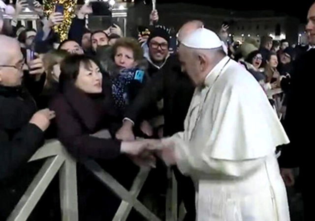 Papa Francis, insanların arasından selamlayarak ve el sıkışarak ilerlerken, bir kadının Papa'nın elinden sertçe çekiştirdi.