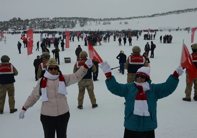 Kars merkez ve Sarıkamış ilçesinde otobüslerle zirveye bırakılan vatandaşlar, ellerinde Türk bayraklarıyla yaklaşık 2 kilometre yürüyerek toplanma alanına geldiler.