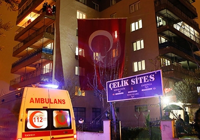 Şehit polisin oturduğu dokuz katlı apartmana beş katı kaplayacak şekilde Türk bayrağı asıldı.