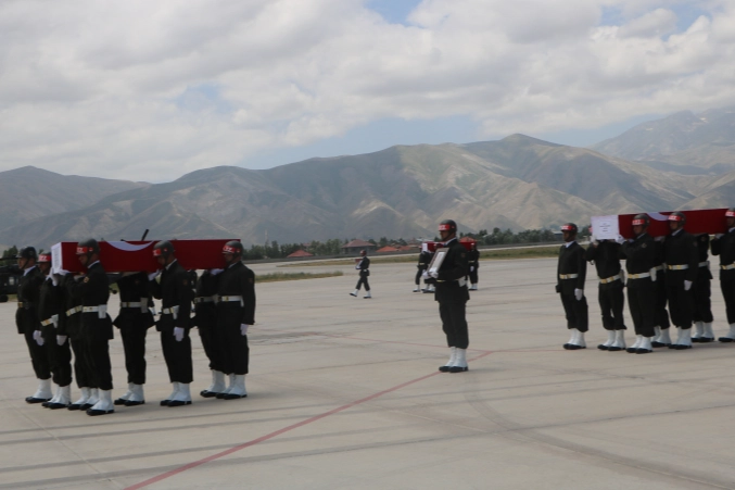 Yüksekova Selahaddin Eyyubi Havalimanı'nda düzenlenen törende şehit İstihkam Üsteğmen Ege Akar, Mühimmat Astsubay Kıdemli Çavuş Abdurrahman Akdoğan, piyade sözleşmeli erler Ahmet Kuşak, Özkan Özkanlı, Ahmet Gültekin ve Mahsun Yeşildemir'in Türk bayraklarına sarılı naaşları alana getirildi.