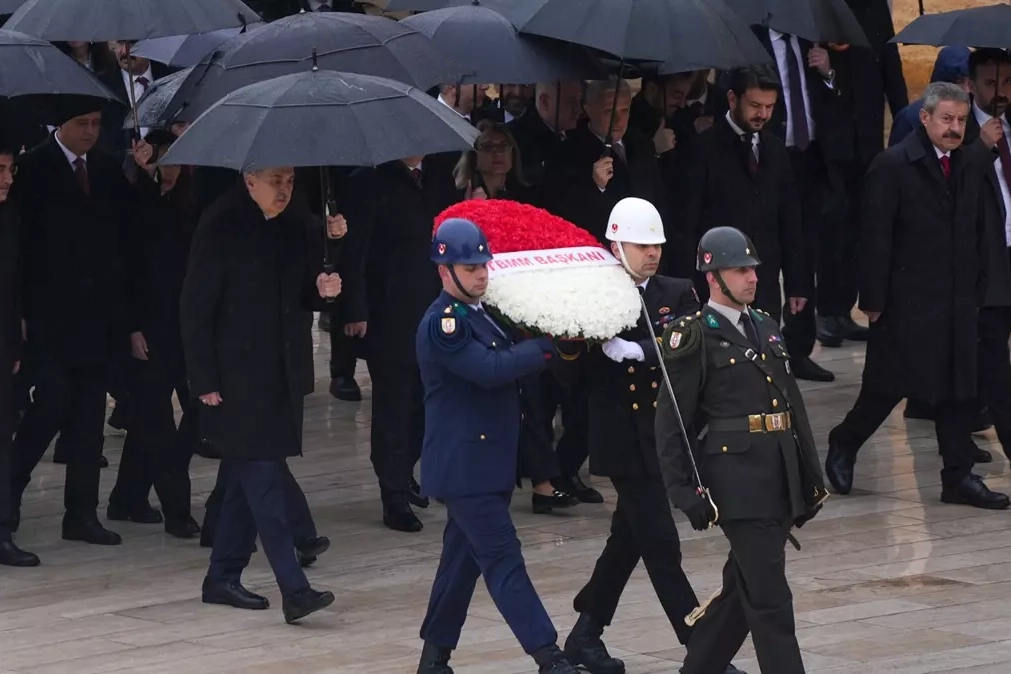 Aslanlı Yol'dan yürüyerek Gazi Mustafa Kemal Atatürk'ün mozolesine gelen heyet, TBMM Başkanı Kurtulmuş'un mozoleye çelenk bırakmasının ardından saygı duruşunda bulundu ve İstiklal Marşı'nı okudu.