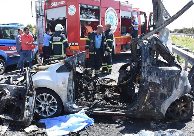 Şiddetli çarpmanın etkisiyle otomobil alev alarak yanmaya başladı. Yoldan geçenlerin yangın söndürme tüpleriyle müdahale ettiği alevler kısa sürede tüm otomobili sardı. Otomobilde bulunanlar ise bir anda alev topuna dönen araçtan çıkamadı.
