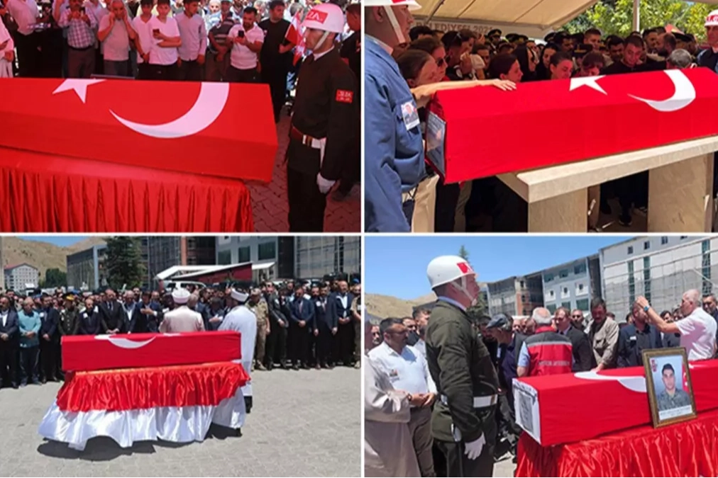 Pençe-Kilit Harekatı bölgesinde terör örgütü mensuplarınca kullanılan mağaradaki arama tarama faaliyetinde metan gazından etkilenerek şehit olan askerlerimiz son yolculuklarına uğurlanıyor.