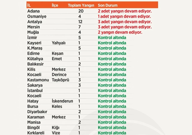 Tabloya göre, söndürme işlemleri devam eden yangınlar ise şu şekilde sıralandı;