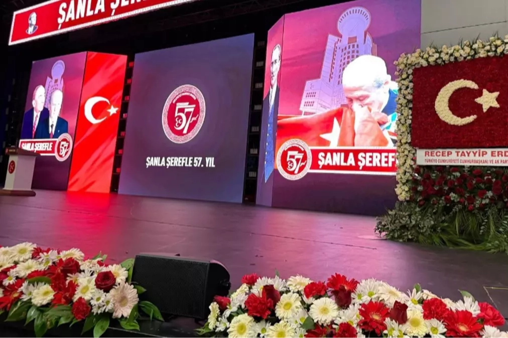 Bayrağın etrafında ise MHP'nin kuruluşunun 57. yıl dönümüne ithafen 57 gül yer alıyor.