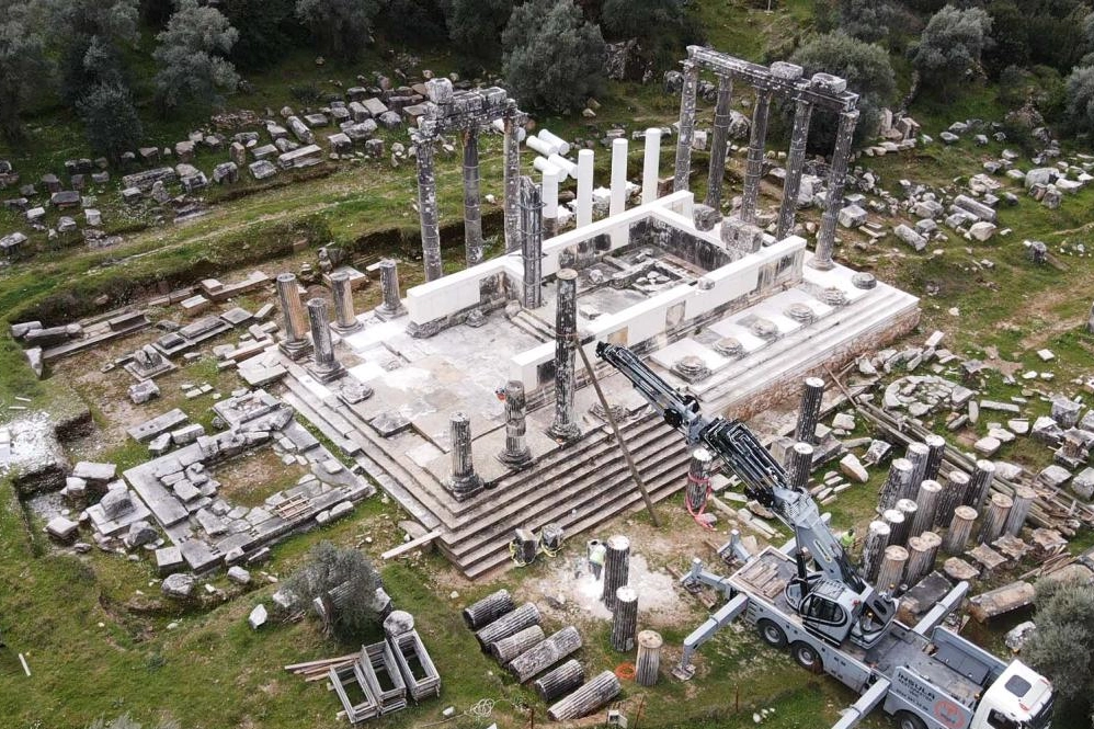 Selimiye Mahallesi'ndeki, Milattan Önce 2'nci yüzyılda inşa edilmiş Euromos Antik Kenti'nde kazılar devam ederken, kentte bulunan 1860 yıllık Zeus Lepsynos Tapınağı'nın zamana yenik düşmüş sütunlarının restorasyonu yapılıyor.