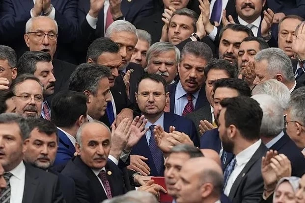 Verilen aranın ardından AK Partili milletvekilleri kürsü etrafında çember oluşturdu. İçişleri Bakanı Mustafa Çiftçi ile Adalet Bakanı Akın Gürlek, Anayasa’nın 106. maddesi gereğince bu çemberin içinde yemin ederek görevlerine başladı.