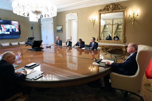 Avrupa Birliği'nin (AB) düzenlediği Fikirdaş Ülke Liderleri Çevrimiçi Toplantısı'na Vahdettin Köşkü'nden katılan Cumhurbaşkanı Recep Tayyip Erdoğan, burada yaptığı konuşmada, Türkiye olarak ilk günden itibaren savaşın diyalog yoluyla sonlandırılması için çok yoğun ve samimi çaba harcadıklarını belirtti.