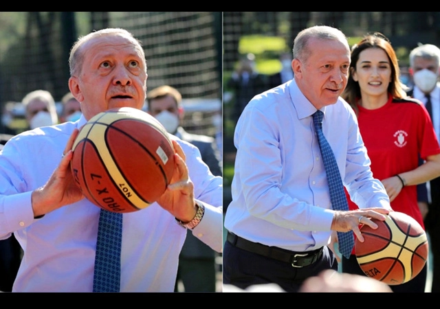 Basketbol sahasındaki gençlerin davetini kırmayan Cumhurbaşkanı Erdoğan, Cumhurbaşkanı Sözcüsü İbrahim Kalın'la birlikte ekibe katıldı.