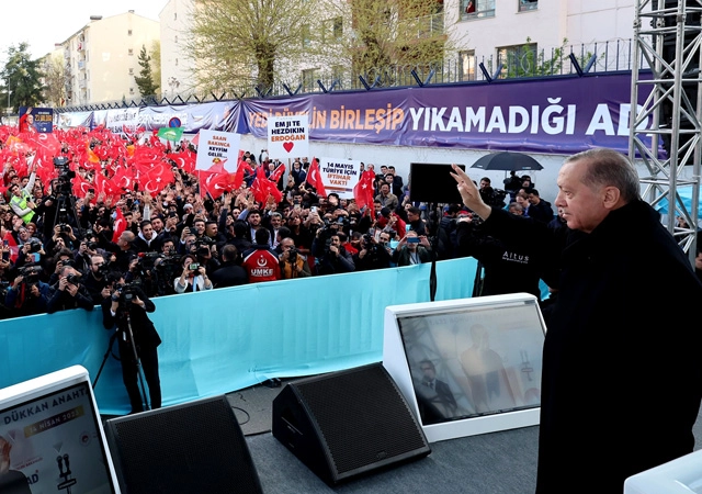 "Ama öyle yapmadılar. Çünkü bunların böyle bir irade sergileyecek salahiyetleri yok. Bunlara verilen görev, emperyalizmin uşaklığını yapmaktır. Bunların siyasi parti kisvesi altında çalışan uzantıları aynıdır. Sizlerin oyuyla, bu ülkeye, bu millete, bu milletin tüm değerlerine düşmanlık yapan, ideolojik sapkınlıkları Meclis'e gönderenlerin Diyarbakır'a hizmet gibi bir çabası olabilir mi? Kandil'den ne diyorlar? Kandil'den Bay Bay Kemal'i destekleyeceklermiş. Oradan talimat veriyorlar. Benim Kürt kardeşlerimi de böyle aldatacaklarını zannediyorlar. Buna inanıyor musunuz? Buna gereken dersi 14 Mayıs'ta vermeye var mıyız? Öyleyse durmak yok. Bunlardan hangisinin kimin ne derdine derman olduğunu, kimin hangi yarasına merhem olduğunu gördünüz değil mi? Bunlar benim Diyarbakır annelerinin yavrularını dağa kaçırmadılar mı? O genç yavrularımızı Kandil'e kaçırmadılar mı? Orada bunları taciz etmediler mi? Öyleyse bunlara, 14 Mayıs'ta tarihi bir ders vermeye var mıyız? Kafası da kalbi de gözü de bu ülkenin dışına dönük olanlardan ne bize ne bu topraklara hayır gelir. Üstelik bir de gittiler, bu ülkede Diyarbakır'a ve Kürt kardeşlerime en çok eziyet etmiş, tek parti faşizminin temsilcisi CHP'nin kurduğu masaya yancı yazıldılar."