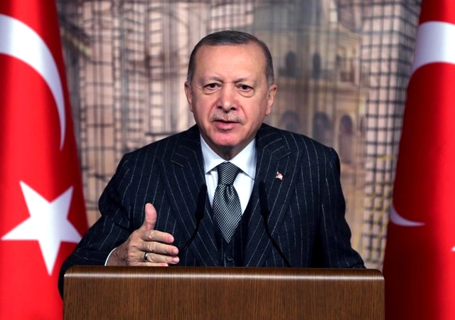 Erdoğan, kabulde bir konuşma yapmak üzere kameralar karşısına geçti.
