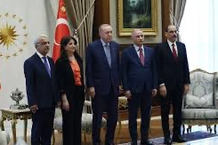 "DEM Parti İmralı Heyeti üyelerimiz Pervin Buldan ve Mithat Sancar, bugün Sayın Cumhurbaşkanı Recep Tayyip Erdoğan'la Beştepe'de görüştü. Heyetimiz, sürecin geldiği yeni aşama ve bundan sonra yapılacaklar konusunda görüş ve önerilerini aktardı. Görüşmede, sürecin ilerlemesi konusunda karşılıklı iradenin devam ettiği vurgulandı."