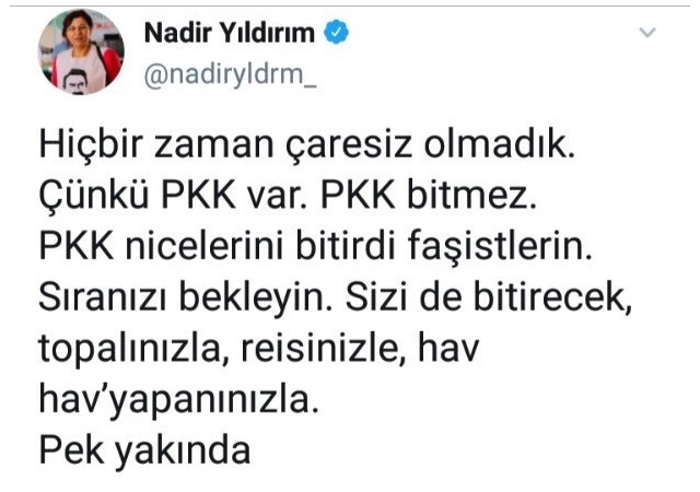 HDP'li Nadir Yıldırım twitinde: “Hiçbir zaman çaresiz olmadık. Çünkü PKK var. PKK bitmez. PKK nicelerini bitirdi faşistlerin. Sıranızı bekleyin. Sizi de bitirecek, topalınızla, reisinizle, hav hav'yapanınızla. Pek yakında” diye yazdı.
