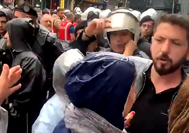 Bebek katili Öcalan için polise kalkan oluşturan HDP'li vekillerin yanındaki Aydeniz, polise yumruk attı.