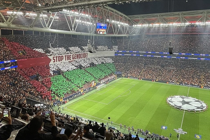 Ev sahibi takımın taraftarları, maç öncesi seremoni sırasında Filistin'e destek sunan bir koreografi gerçekleştirdi.