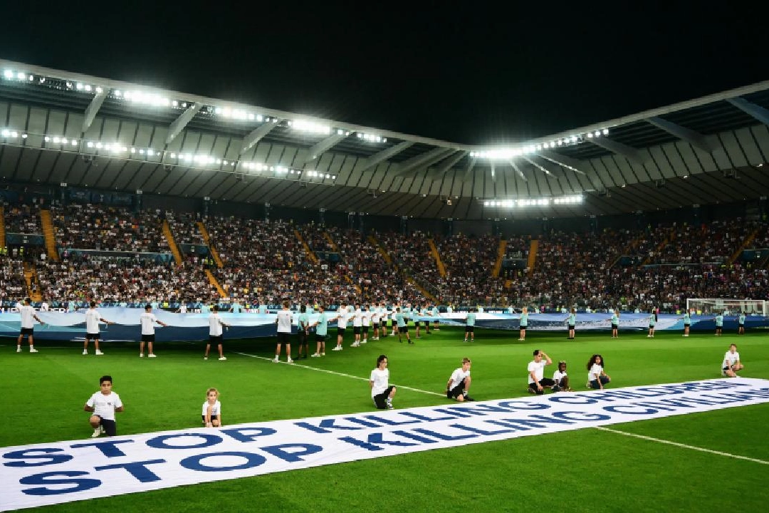 Karşılaşma öncesi yapılan törende UEFA, "Çocukları öldürmeyi durdurun" ve "Sivilleri öldürmeyi durdurun" yazan iki pankart açtı. Ayrıca madalya töreninde de iki Filistinli çocuğu ağırlayan UEFA'nın açılan pankartlarda ve başka bir bölümde İsrail'in adını geçirmemesi, bir kez daha tepkilere neden oldu.