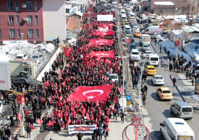 Yürüşe katılan Hakkarililere teşekkür eden Vali Akbıyık, "Suriye'de şehit olan askerlerimiz için selam yolluyoruz. Sadece İdlib'te şehit vermiyoruz. Çanakkale, Malazgirt ve 15 Temmuz'da şehit verdik. Türk ordusu, kahramanlık yapıyor." dedi.
