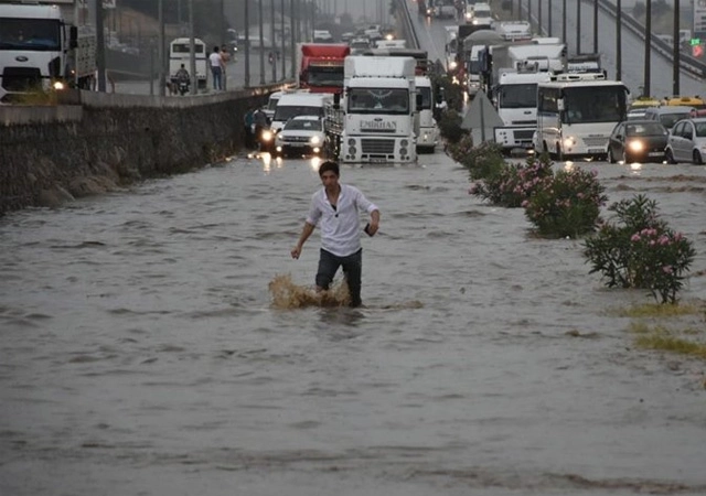 Manisa'nın Turgutlu ilçesinde yoğun sağanaktan ötürü İzmir-Ankara kara yolunda ulaşım her iki yönde de durmak zorunda kaldı.