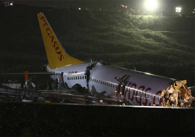 Akşam saatlerinde İzmir İstanbul seferi gerçekleştiren, Sabiha Gökçen Havalimanı'na inmeye çalışan Pegasus'a ait uçak, pistten çıkmış bunun sonucu üç parçaya bölünmüştü.