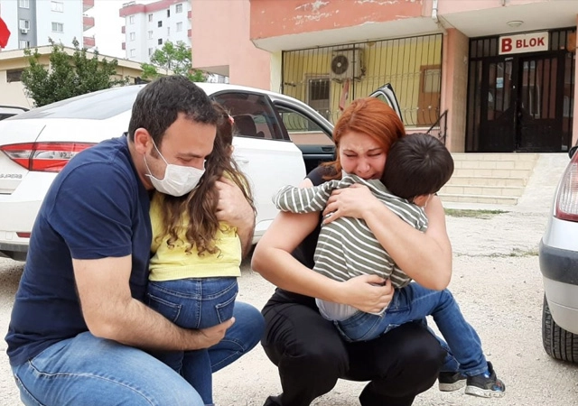 Oturdukları apartmanın girişinde anne ve babasını gören çocuklar, gözyaşları dökerek anne ve babalarına sarıldı.